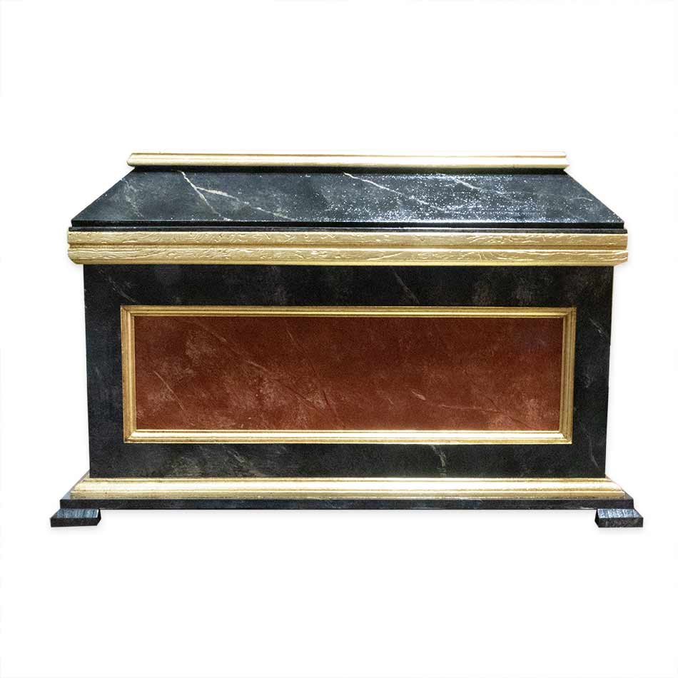 Arqueta – relicario con imitación a mármol rojo y negro, y molduras doradas en pan de oro. Tapa extraíble con cerradura en ambos laterales.