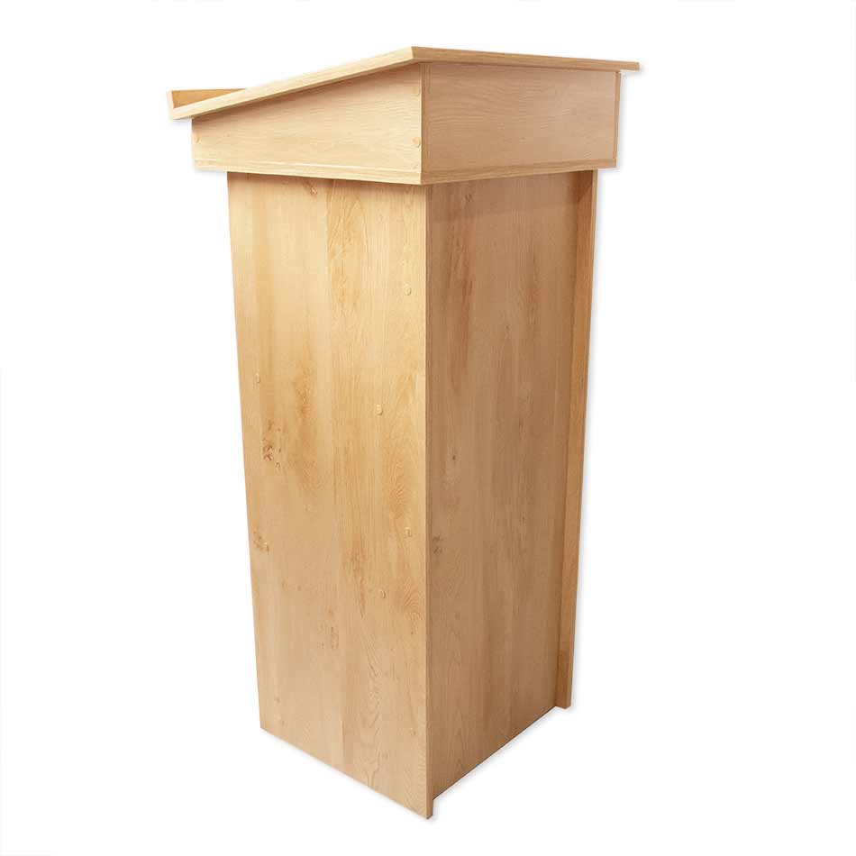 Atril sencillo realizado en tablero de melamina en color roble, con baldas en la parte interior.