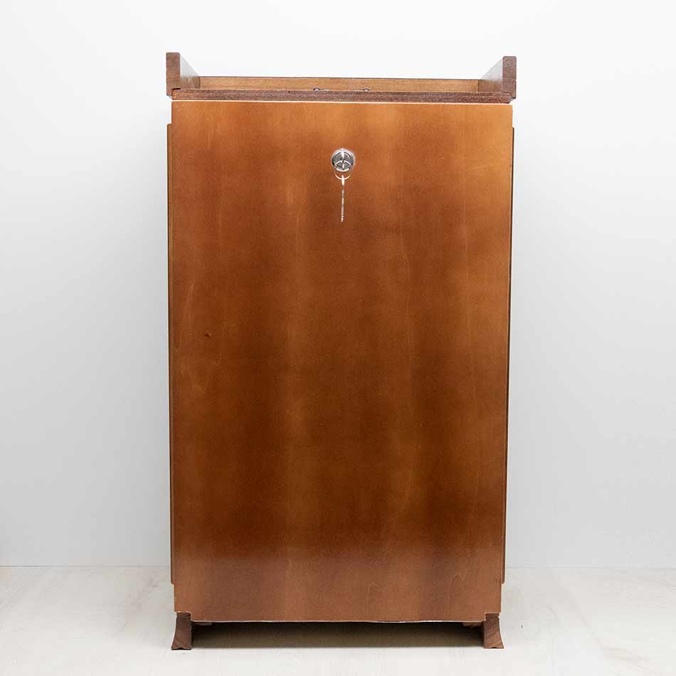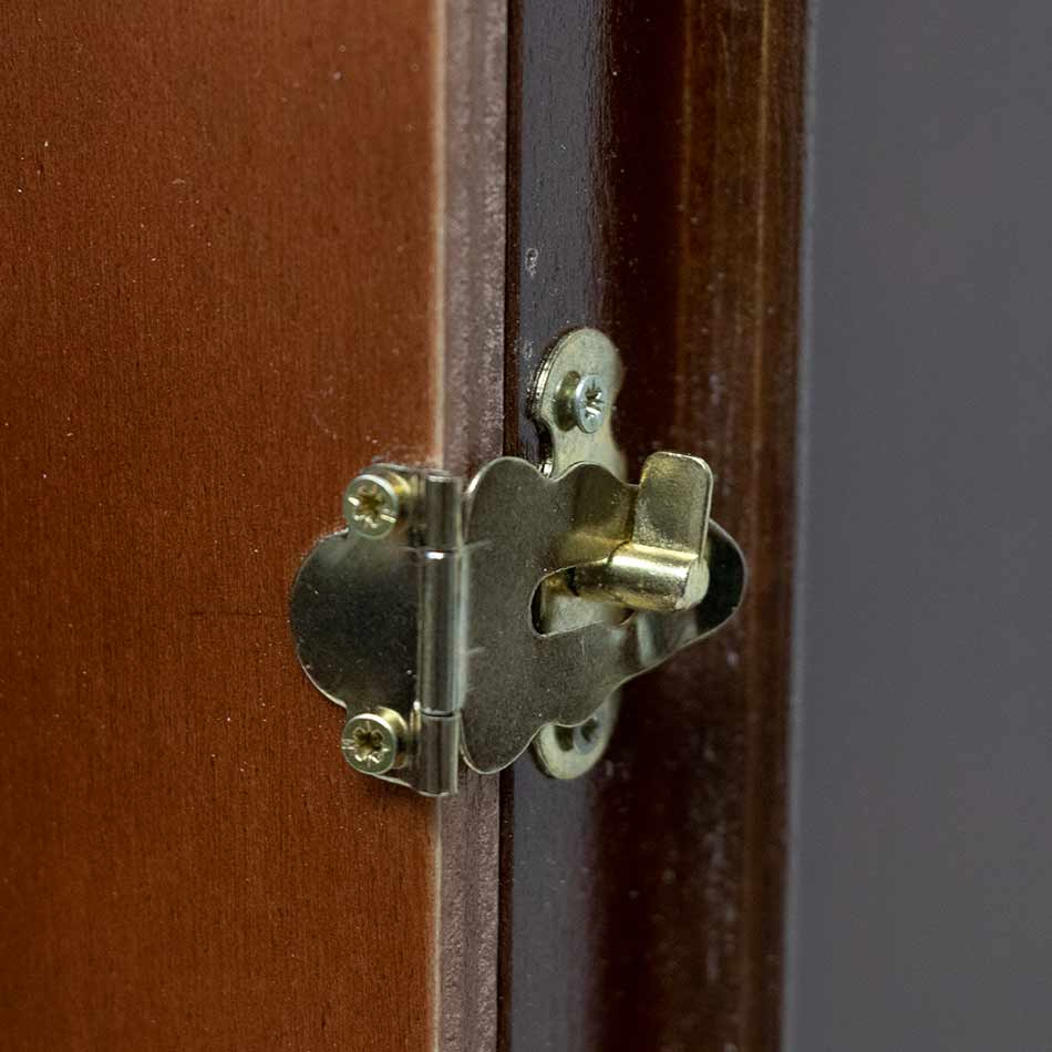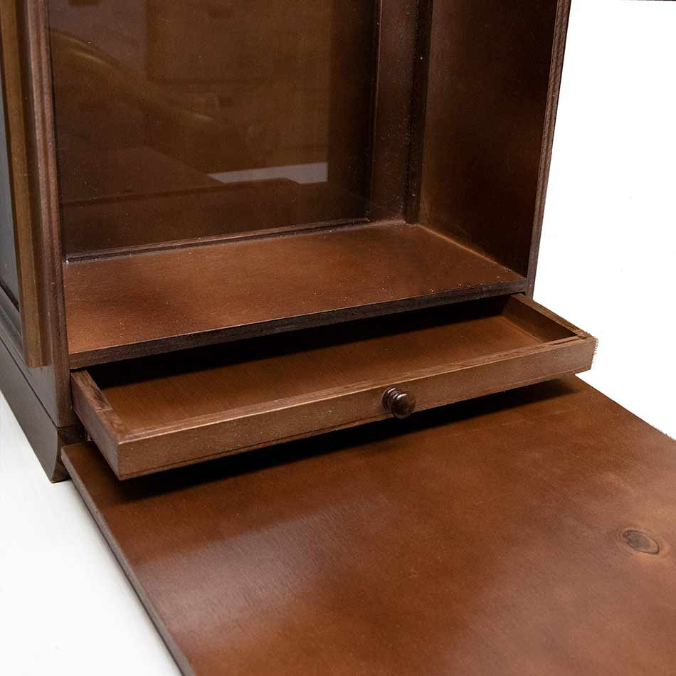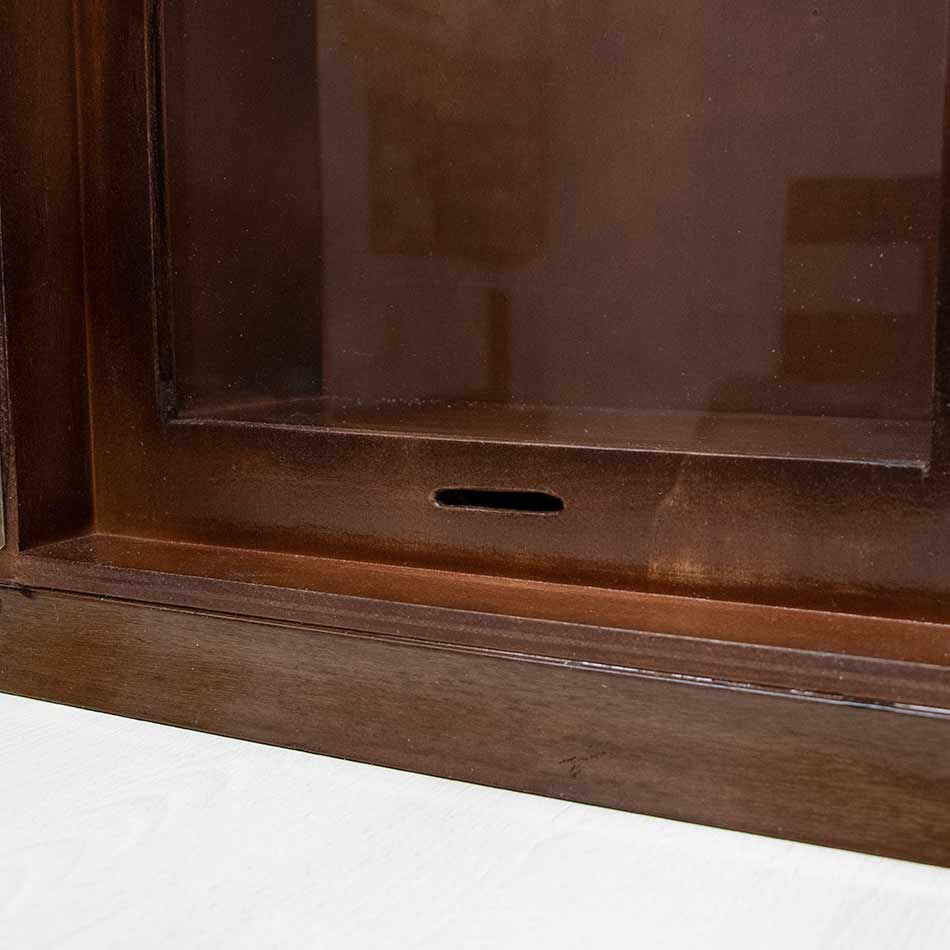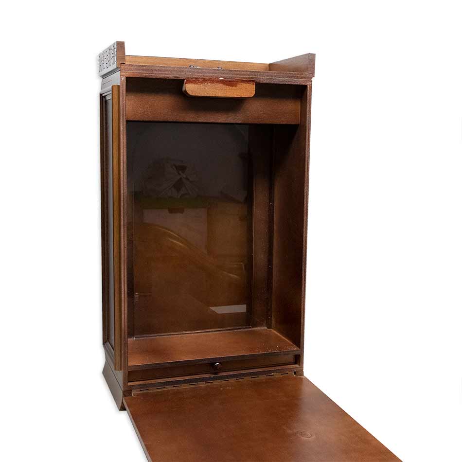 Capilla domiciliaria barnizada con puerta delantera, cristal, hucha y asa. Apertura por la parte trasera.