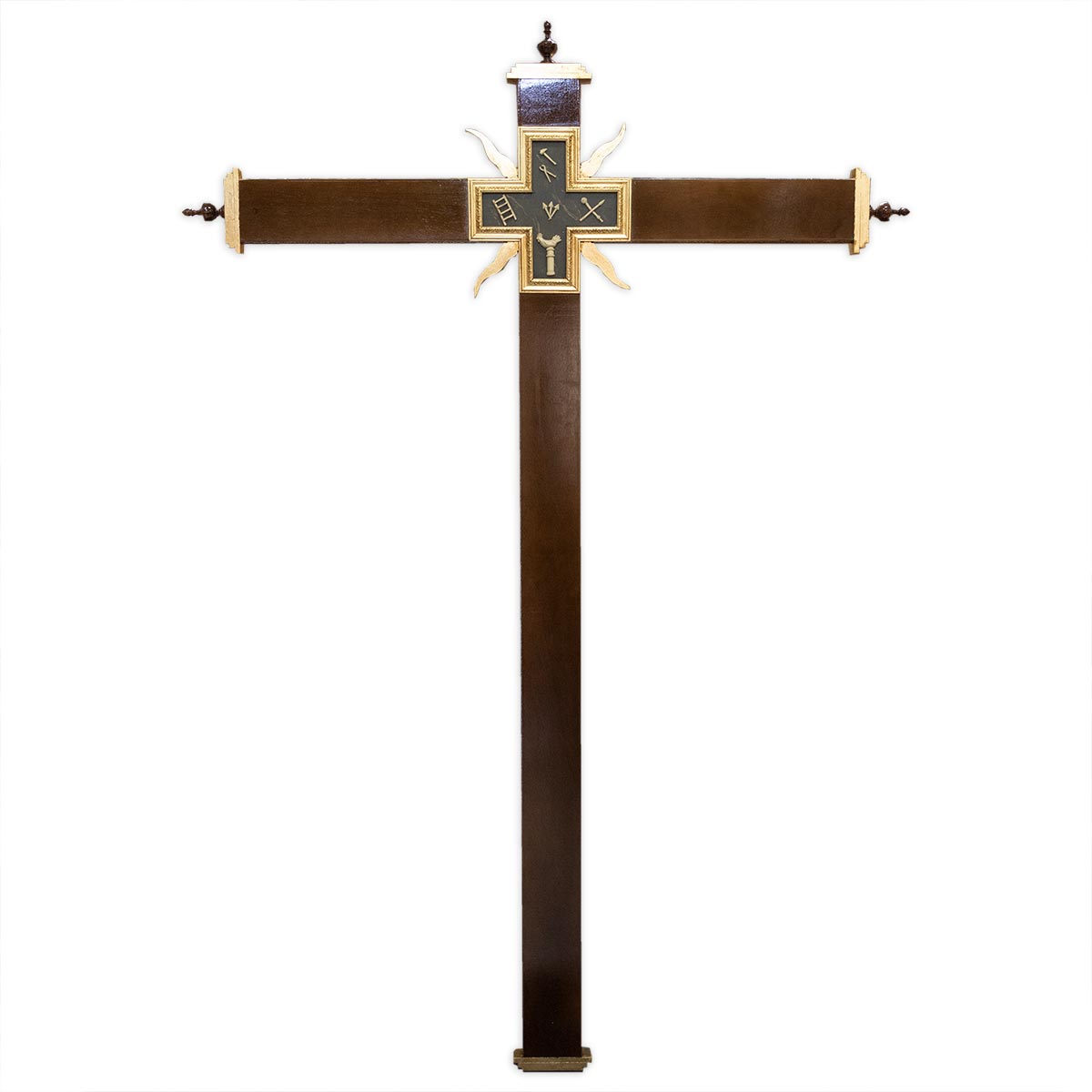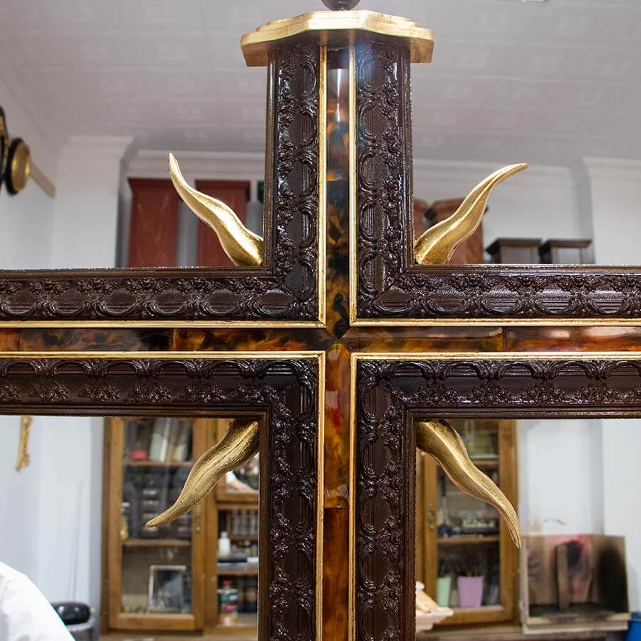 Cruz de guía barnizada, con calle central con imitación a carey y filo dorado.
