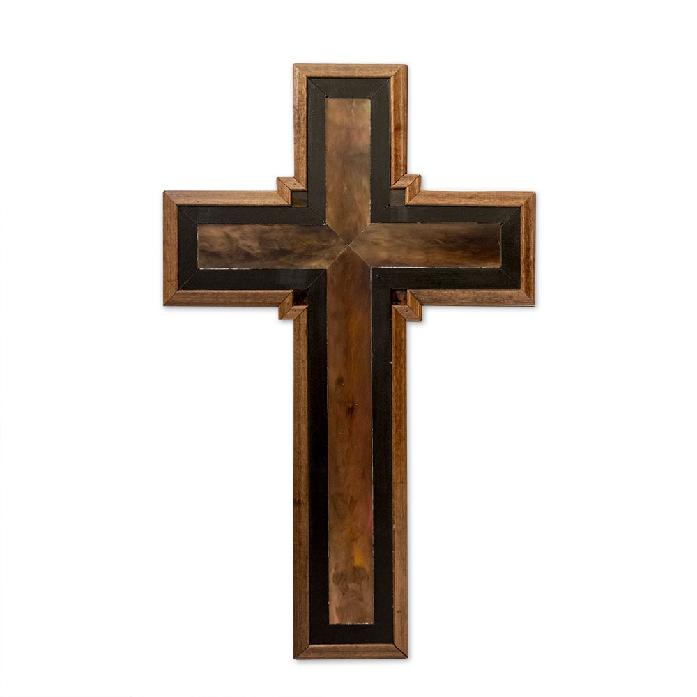 Cruz en madera. Moldura en color nogal. Calles policromadas en negro y decoración con imitación a carey.