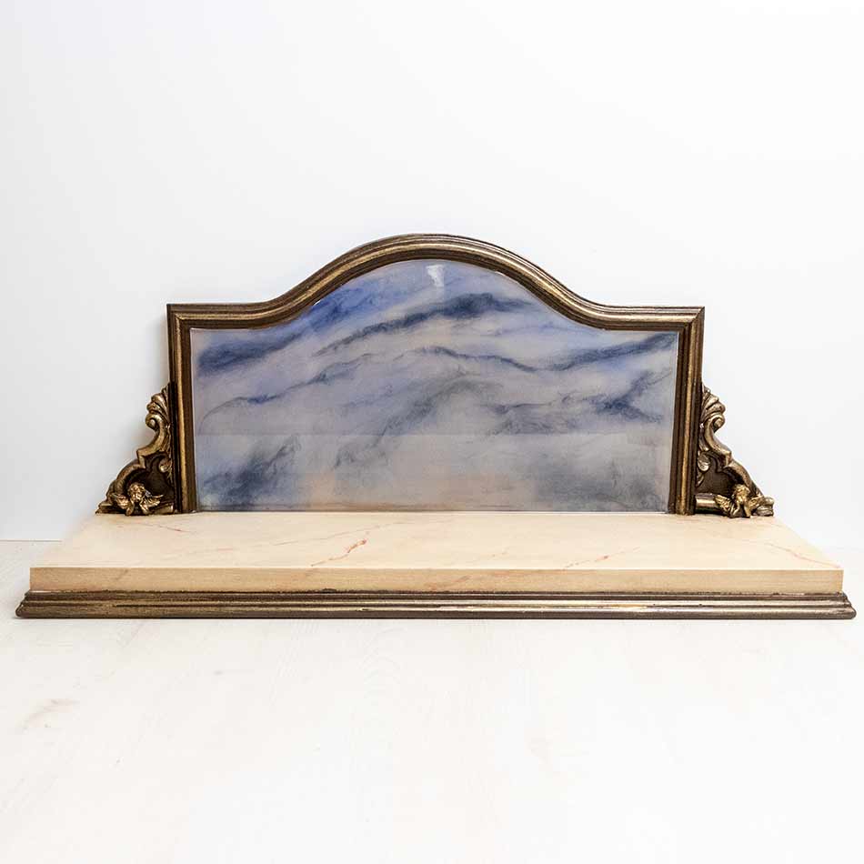 Dosel para Misterio / Portal de Belén. Fondo con imitación a jaspe azul. Suelo con imitación a mármol. Policromado en marrón con pátina de dorado.