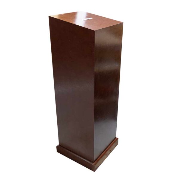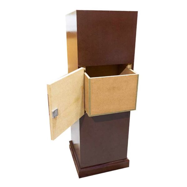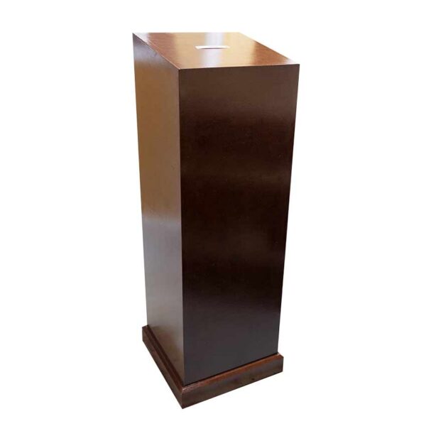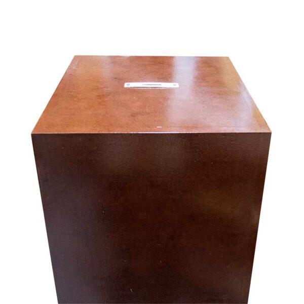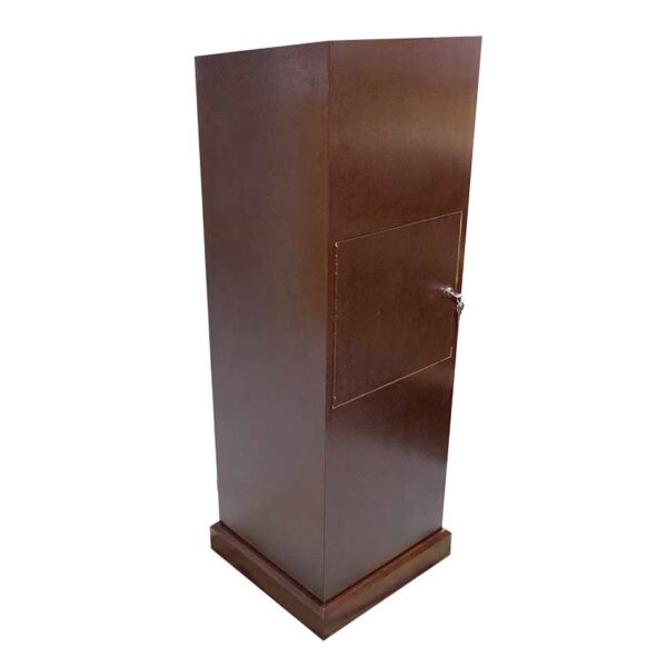 Limosnero policromado en marrón oscuro. Apertura por la parte trasera, con cierre de seguridad y cajón interior extraíble.