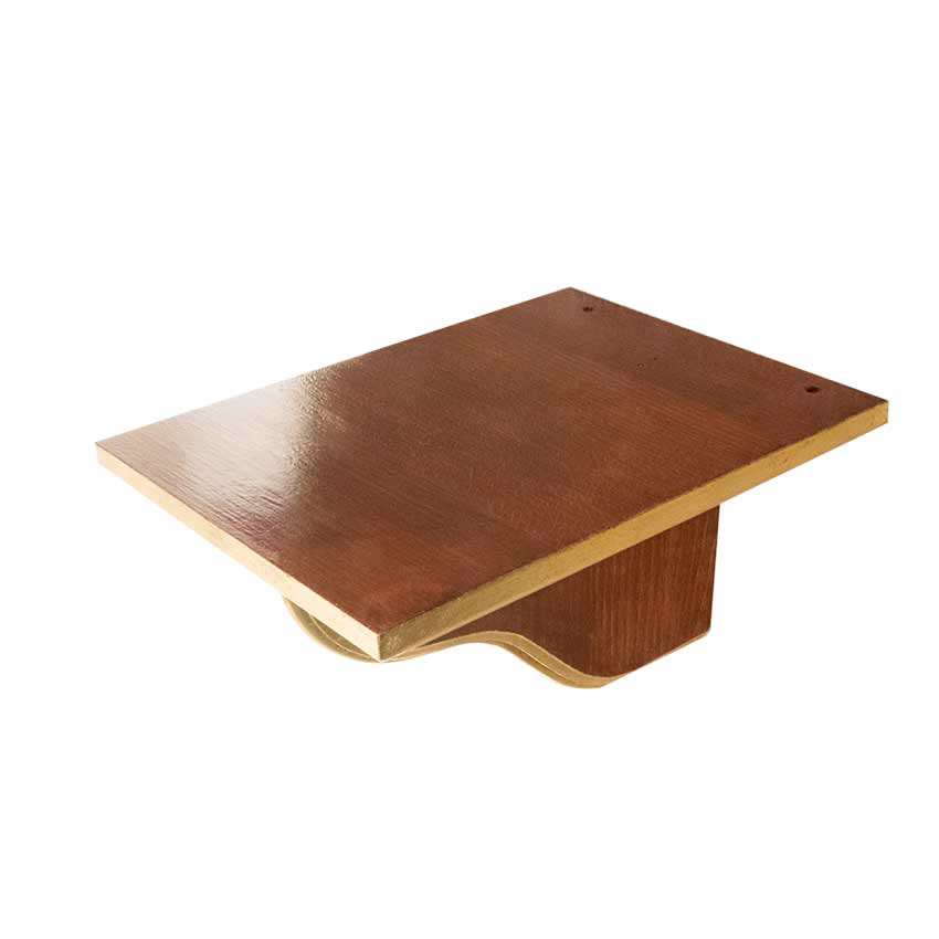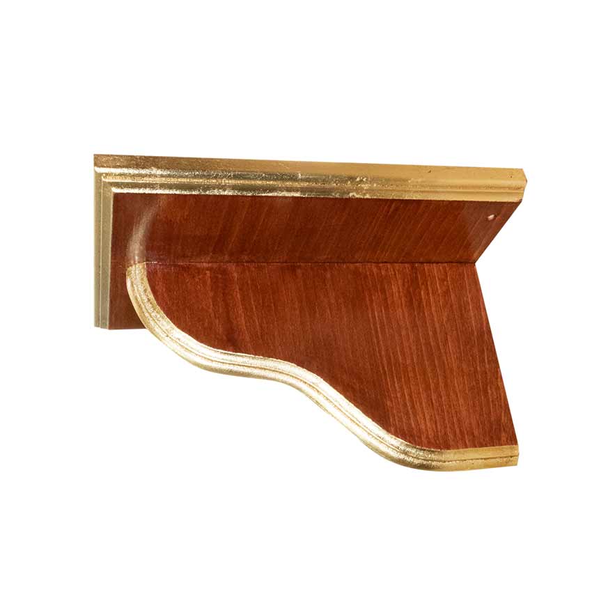 Ménsula / repisa de pared realizada en madera barnizada en color sapeli y filos dorados en pan de oro.