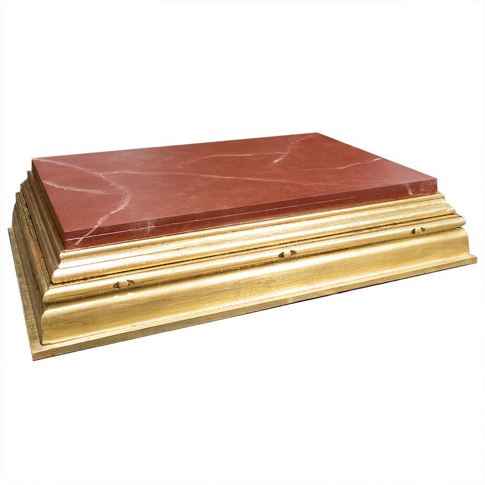 Peana para imagen a tres caras dorada en pan de oro y suelo con imitación a mármol rojo.