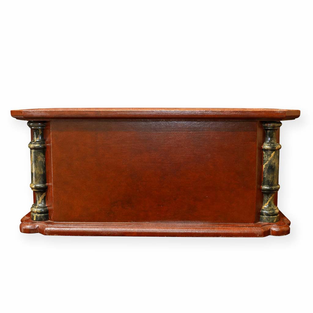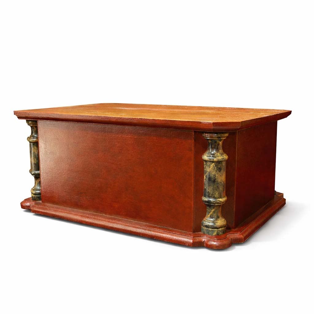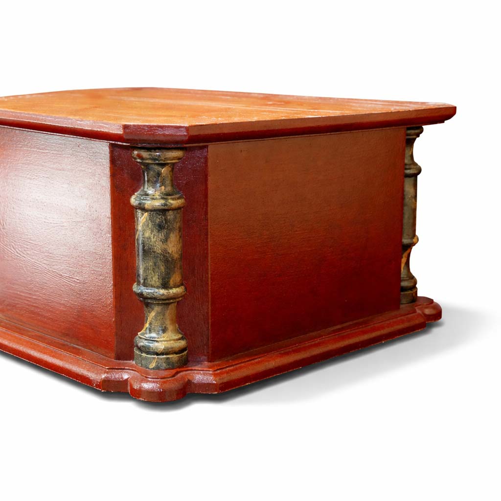 Peana policromada en rojo con esquinas en chaflán y columnas con imitación a mármol