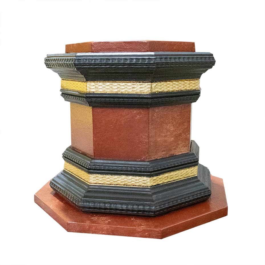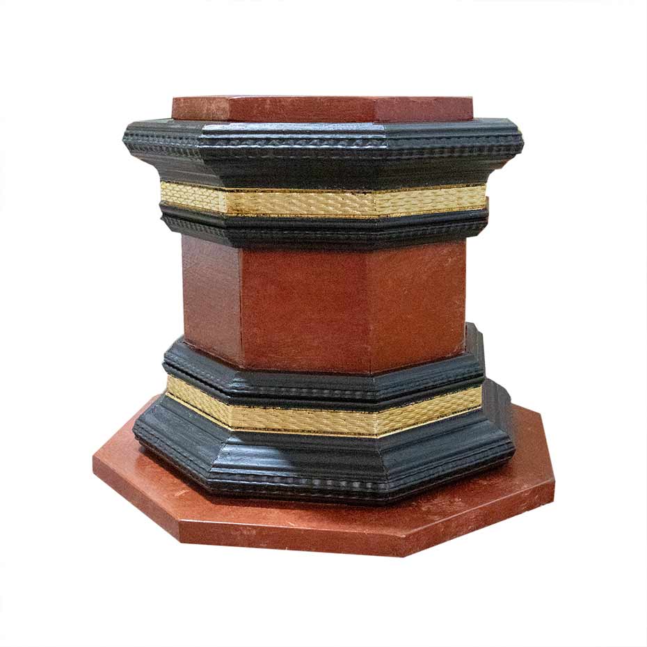 Peana octogonal con imitación a mármol rojo, con molduras policromadas en negro y doradas en pan de oro