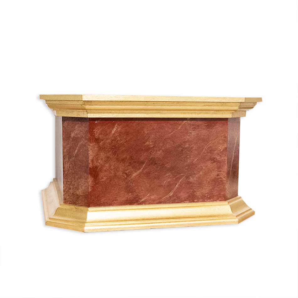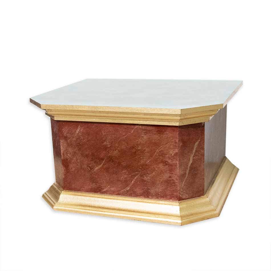 Peana a tres caras con imitación a mármol rojo, moldurad doradas en pan de oro de imitación y suelo en imitación a mármol de tonos azules.