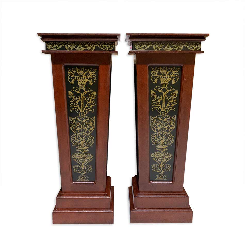 Pedestal policromado en rojo teja con pátina y ornamento en caras laterales y cenefa superior.