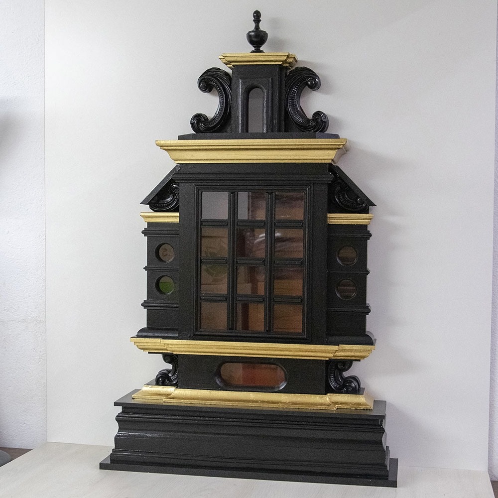 Relicario policromado en negro con detalles dorados en oro bajo.