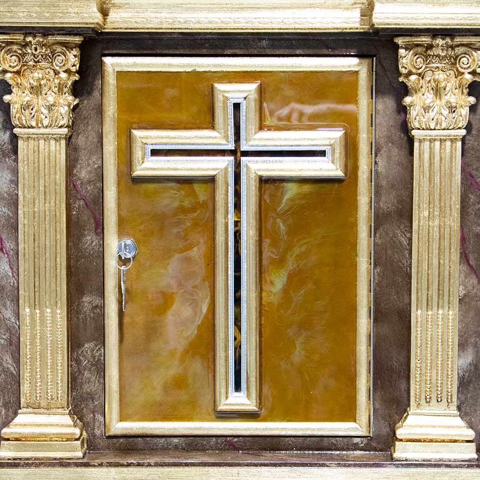 Sagrario con imitación a mármol marrón. Puerta con cruz con imitación a carey. Dorado en pan de oro.