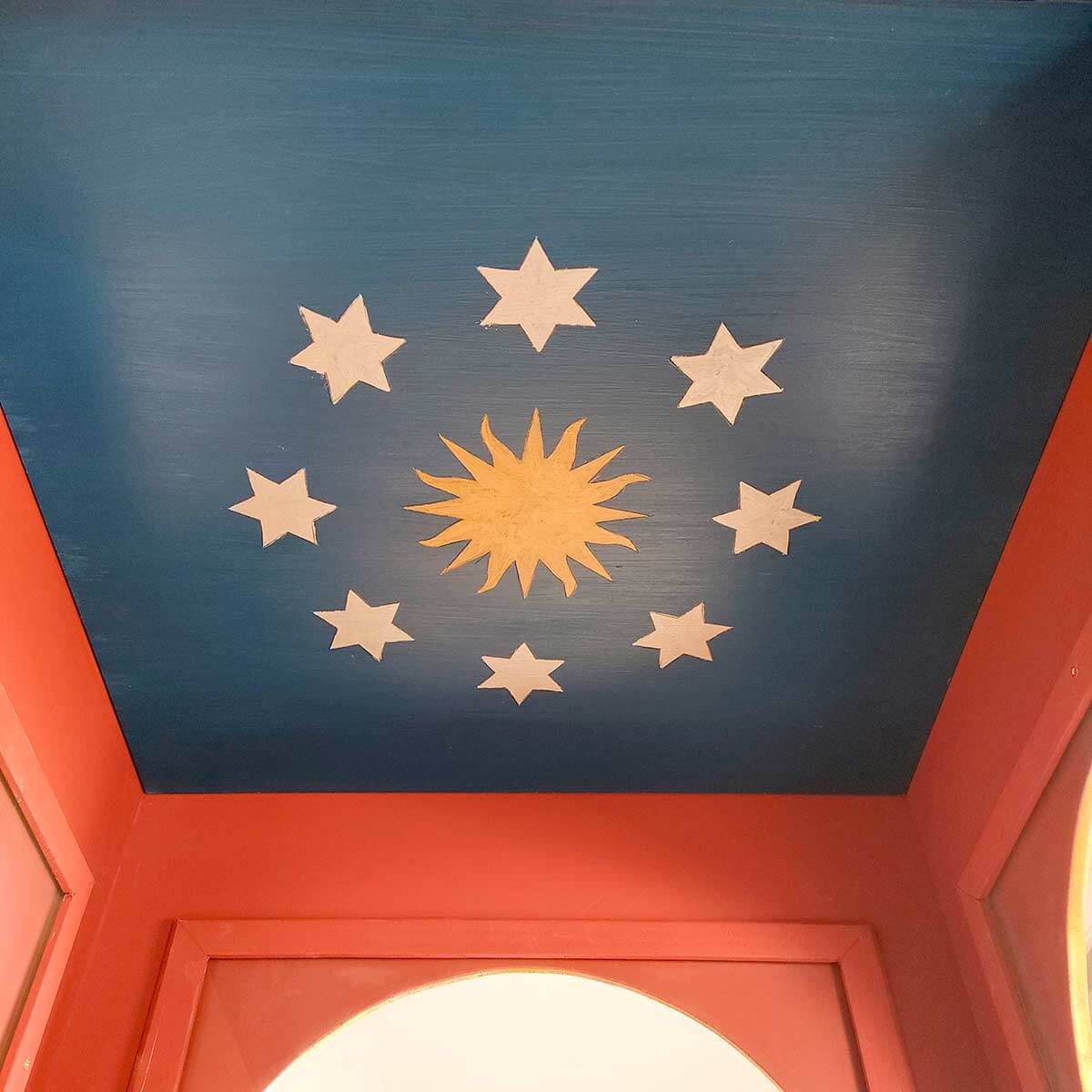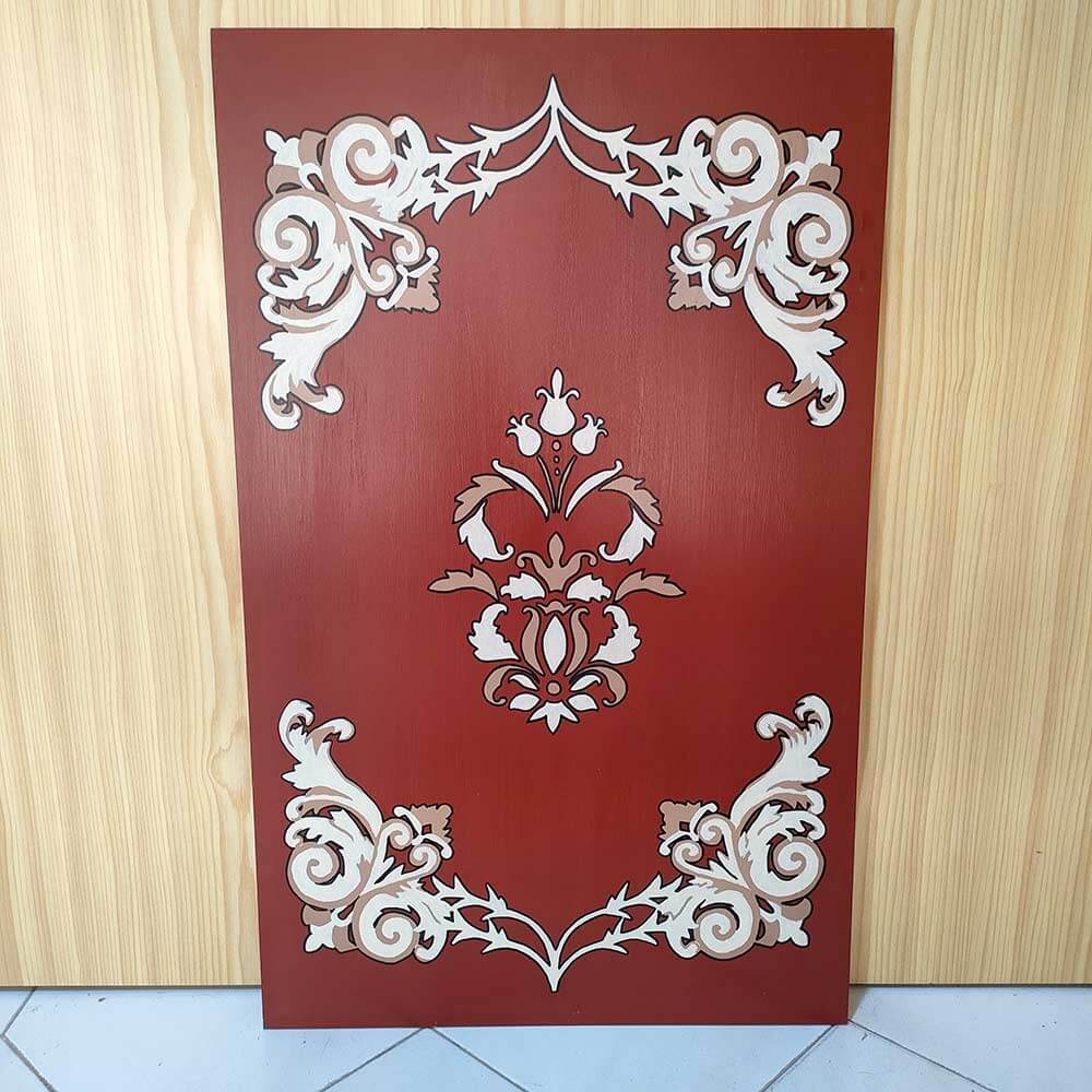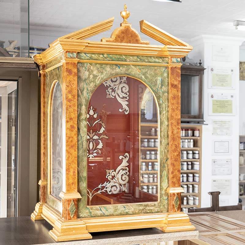 Urna marmoleada en verdes y marrones con molduras doradas en pan de oro.