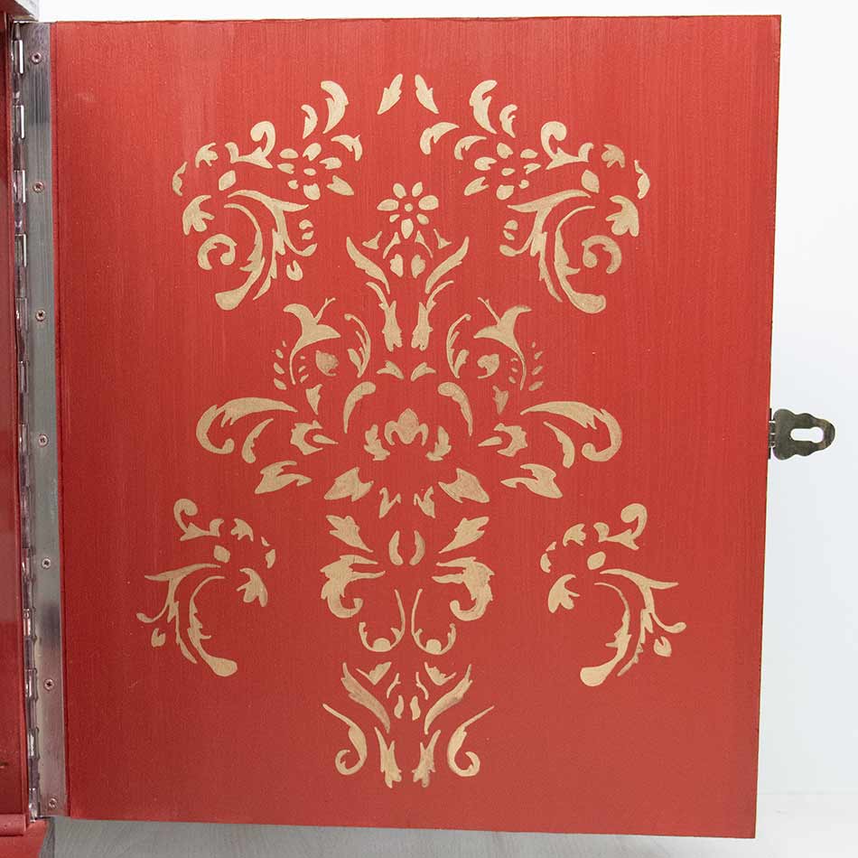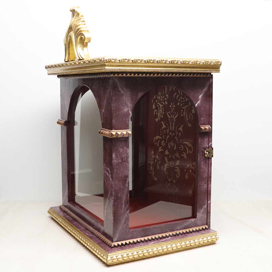 Urna para imagen con imitación a mármol, dorado en pan de oro y pátina de dorado con desgaste. Dibujo pintado a mano en el fondo. Apertura por la parte trasera.